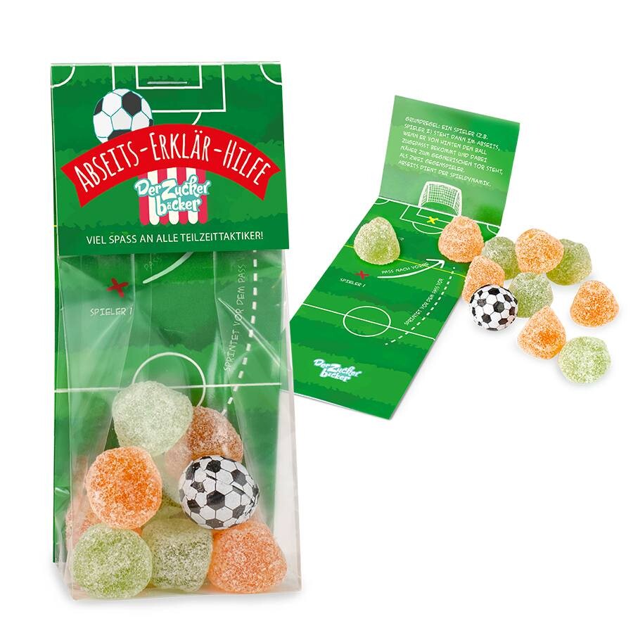 Eine kleine Stuetze fuer die komplizierten Fussballregeln. Ganz einfach Abseits erklaeren mit Vitamin C haltigen Fruchtkugeln und einem Fussball Kaugummi. n Sind wir mal ehrlich. Fussball kann schon ganz schoen kompliziert sein. Der Schiri pfeift das Abseits und der Ball geht an die gegnerische Mannschaft. Aber was ist dieses Abseits eigentlich? Und wer kann mir das erklaeren? Mit der Abseitserklaer-Hilfe geht Dir ganz bestimmt ein Licht auf. Essbaren ?Taktikkuegelchen?, ein essbarer Kaugummi Fussball und ein skizziertes Spielfeld werden zum praktischen Helfer in der Not. Das Erklaeren (von anderen) mit Haenden und Fuessen ist vorbei. Einfach Naschbeutel aufmachen, Taktikkuegelchen auf dem Spielfeld platzieren und los geht?s. Natuerlich lassen wir Dich nicht so einfach im Regen stehen. Auf dem Spielfeld sind ein paar Hilfslinien und Saetze markiert, damit klappt es auf jeden Fall. Du kannst Dir auch jederzeit einen Fussballkenner zur Seite nehmen und nachfragen. Als Belohnung darfst Du die suessen Fruchtsaftbeeren einfach aufnaschen. Leckerer Apfel- und Pfirsichgeschmack mit Vitamin C versuessen Dir jede brenzlige Situation. Viel Spass an alle Teilzeittaktiker.