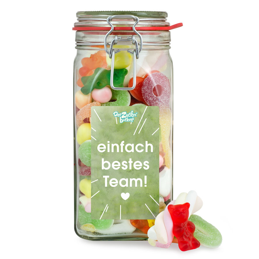 Teamwork makes the dream work! Das ?Bestes Team? Suessigkeitenglas ist nicht nur ein suesses Geschenk, sondern auch eine Moeglichkeit, Freundschaft und Zusammenhalt zu zeigen. n Hast du ein tolles Team, das immer zusammenhaelt und gemeinsam durch dick und duenn geht? Dann ist das Bestes Team Suessigkeitenglas das perfekte Geschenk fuer dich und deine Kollegen! Dieses suesse Buegelglas steckt voller leckerer Fruchtgummis, Marshmallows und anderen Koestlichkeiten. Zeige deinem Team, wie sehr du ihre Freundschaft schaetzt und ueberrasche sie mit diesem originellen Geschenk.
