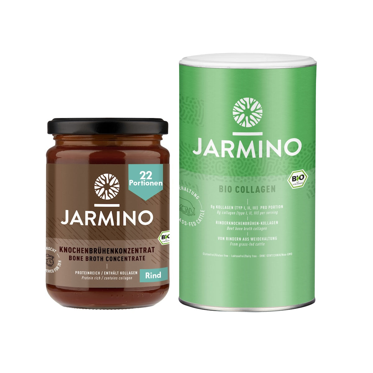 ProduktbeschreibungInnere Stärke Bundle mit unseren Bestsellern vom Weiderind: Knochenbrühen-Konzentrat (220g) + Knochenbrühen-PulverUnser JARMINO Konzentrat von Rinderknochenbrühe sowie unser Knochenbrühen-Pulver in BIO-Qualität von grasgefütterten Rindern aus Weidehaltung liefern Ihnen Ihre täglich Portion natürliche Mineral- und Nährstoffen – darunter Kollagen, Protein, Aminosäuren, Calcium, Eisen, Magnesium, Zink – auf nur einem Löffel. Wir stellen beide Knochenbrühenprodukte in einem natürlichen Prozess ohne Zusatzstoffe aus nur drei Zutaten her: Bio-Knochen vom Weiderind, Wasser und Steinsalz.Trinken Sie täglich eine Tasse Knochenbrühe, in wenigen Sekunden aus unserem Konzentrat hergestellt oder bereiten Sie sich mit unserem Knochenbrühenpulver Ihren Kollagenkaffee oder einen kraftvollen Smoothie oder Shake zu.Qualitätsmerkmale:100% Bio, Weidehaltung & GrasfütterungKollagen der Typen 1, 2 & 3HYDROLYZED+ durch einzigartige Zusammensetzung aus Kollagenhydrolysat (