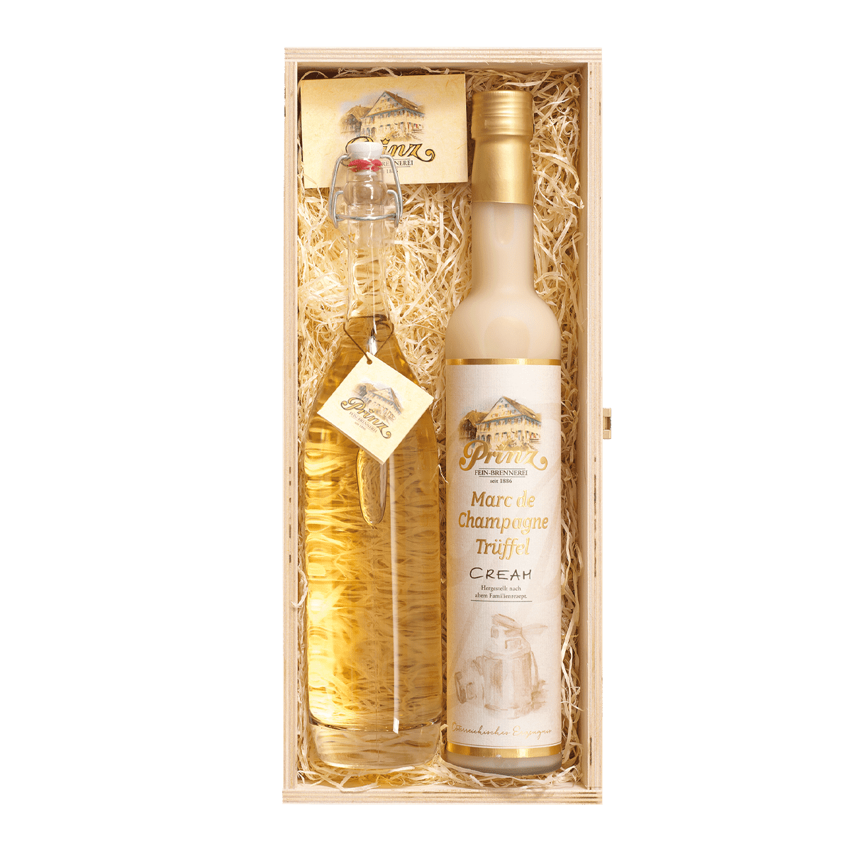 Die Geschenkidee für die Genießer beim Christbaum loben Das Set besteht aus der zartcremigen Marc de Champagne 15% Vol Likör-Spezialität und einer …