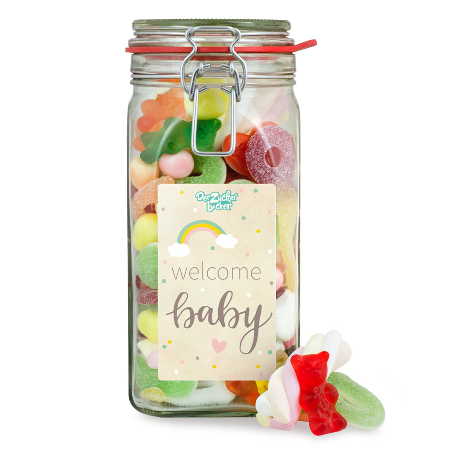 Willkommen in der Welt, kleines Wunder! Mit unserem ?Welcome Baby? Suessigkeitenglas hast Du das perfekte Geschenk fuer die Geburt eines Babys, einer Babyparty oder eine Babyshower gefunden. n Das Welcome Baby Suessigkeitenglas ist nicht nur ein suesses Geschenk fuer die Geburt eines Babys, sondern auch eine tolle Geschenkidee fuer die Babyparty oder die Babyshower. Es ist gefuellt mit verschiedenen Suessigkeiten, die nicht nur lecker sind, sondern auch das Herz erwaermen. Die liebevolle Gestaltung des Glases macht es zu einem echten Hingucker und zaubert jedem Betrachter ein Laecheln ins Gesicht.